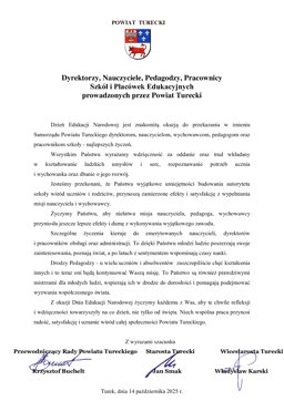 Dzień Edukacji Narodowej jest wspaniałą okazją do przekazania, w imieniu Samorządu Powiatu Tureckiego najlepszych życzeń dyrektorom, nauczycielom, wychowawcom, pedagogom oraz pracownikom Szkół i Placówek Edukacyjnych prowadzonych przez Powiat Turecki.