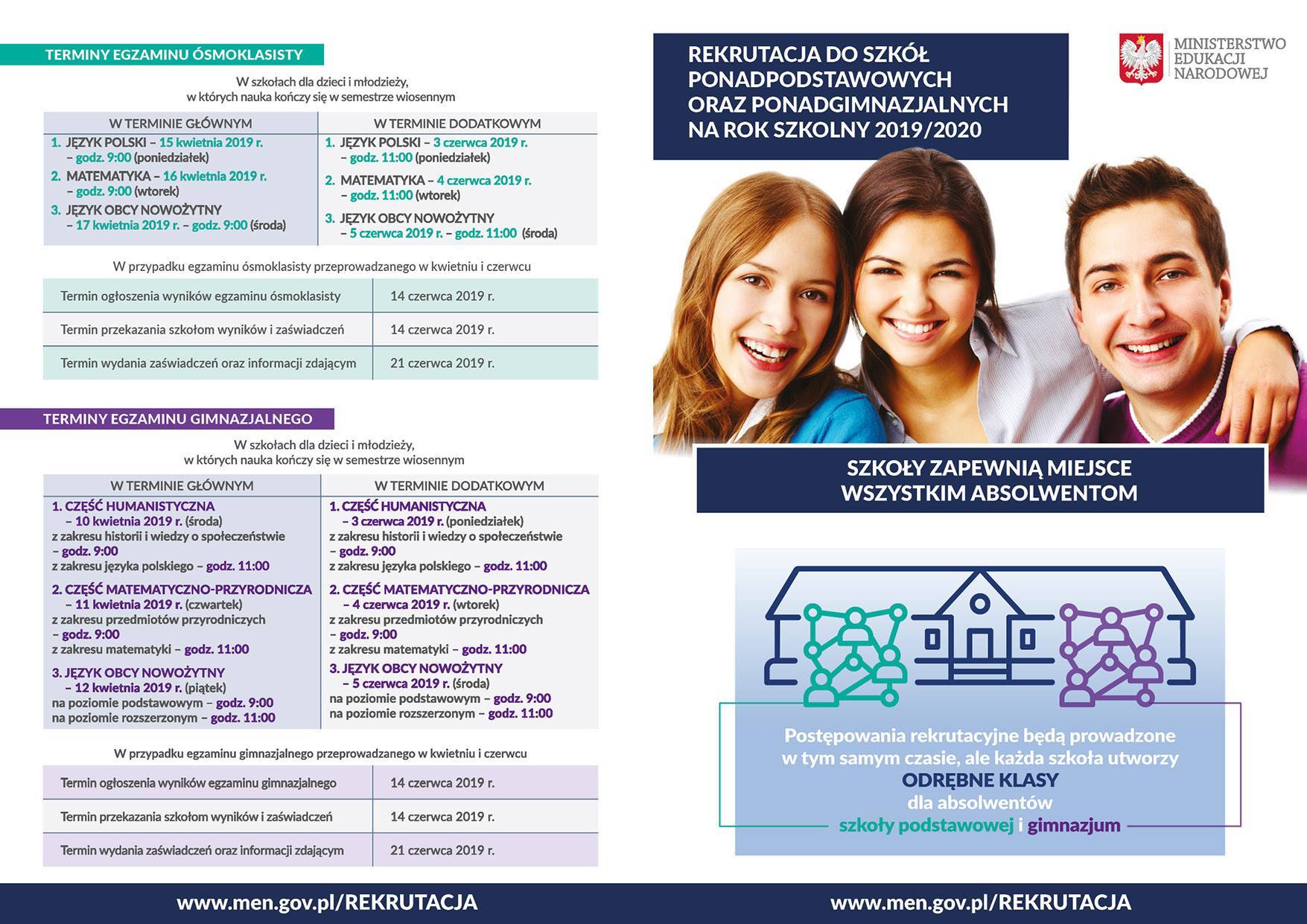 Absolwentów szkół gimnazjalnych i ósmych klas szkół podstawowych oraz Ich Rodziców i Opiekunów zapraszamy do zapoznania się z informacją dotyczącą terminów i zasad rekrutacji do szkół ponadpodstawowych i ponadgimazjalnych na rok szkolny 2019/2020.